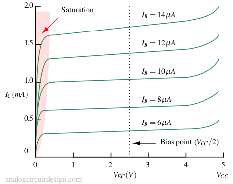 We shall power up (bias) the circuit at IC = 50mA. At this po\int IB = 5mA. We should note the VEC(sat) = 0.4V.