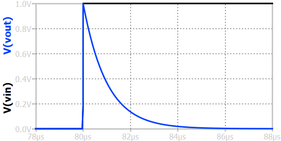 When a step input voltage is applied to a first-order RC high-pass circuit, the output voltage initially responds with a sharp spike (as shown in above figure) and then gradually decays to zero. At the moment the step is applied, the capacitor initially behaves like a short circuit, allowing the sudden change in voltage to appear almost entirely across the resistor, producing a high initial output. As time progresses, the capacitor begins to charge, opposing further changes in voltage, and the output voltage across the resistor decreases exponentially according to \(v_o(t) = V_{in} e^{-t/RC}\). After a long time, when the capacitor is fully charged, no current flows through the circuit, and the output voltage becomes zero. This transient response shows that the RC high-pass circuit effectively transmits rapid changes or high-frequency components of the input signal while rejecting slow or steady (low-frequency) variations.