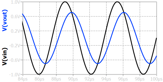 When a sinusoidal input voltage is applied to a first-order RC low-pass circuit, the output voltage is also sinusoidal but with reduced amplitude and a phase shift (delayed) relative to the input. The reduction of amplitude can be calculated using the frequency response plot.