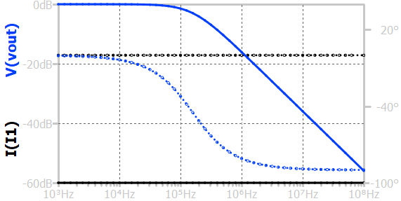 The above figure represents the frequency response of the parallel RC circuit. The input is an AC current source providing 1A of linear current. At low frequencies, the capacitor's reactance is large, causing minimal attenuation; thus, the output amplitude is highest which is I×R, and the phase shift is close to zero. As the input frequency increases, the capacitive reactance decreases, reducing the voltage at the output.