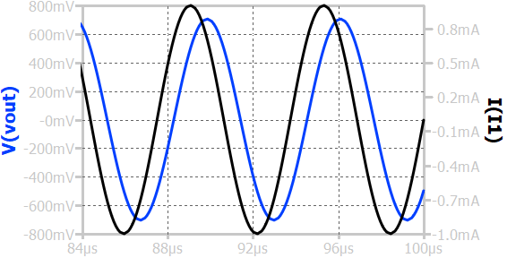 When a sinusoidal input current of amplitude 1A is applied to a first-order RC low-pass circuit, the output voltage (I×R) is also sinusoidal but with reduced amplitude and a phase shift relative to the input current. The reduction of amplitude can be calculated using the frequency response plot.