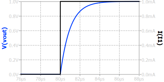 When a step input current is applied to a first-order RC low-pass circuit, the output voltage across the capacitor does not change instantaneously but gradually rises toward the final steady-state value. Initially, the capacitor behaves like a short circuit, and the output voltage is zero. As time progresses, the capacitor charges, and the output voltage increases exponentially.