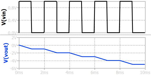 In transient, if a step voltage is applied, the output will ramp till it saturates to the supply voltage. If a square periodic pulses are applied at the input (between 0 and 1), the output will have slope-staircase behavior. The output keeps on decreasing because the current never reverses its direction through Ri. The square wave voltage is always positive.