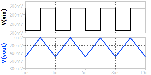 $$v_o(t)=-\int_{-\infty{}}^{t}\cfrac{v_i}{R_iC_F}dt$$